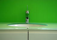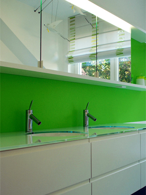 Kinderbad Die entworfenen Badmöbel unterstreichen den leichten und fröhlichen Charakter des Kinderbades, durch die Kombination von dezentem Weiss mit leuchtendem Grün. Die schon vorhandenen Waschtische und Armaturen wurden in das neue Konzept geschickt eingebunden. Die Funktionalität der Möbel wird durch eine integrierte, dimmbare Beleuchtung ergänzt.