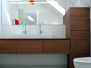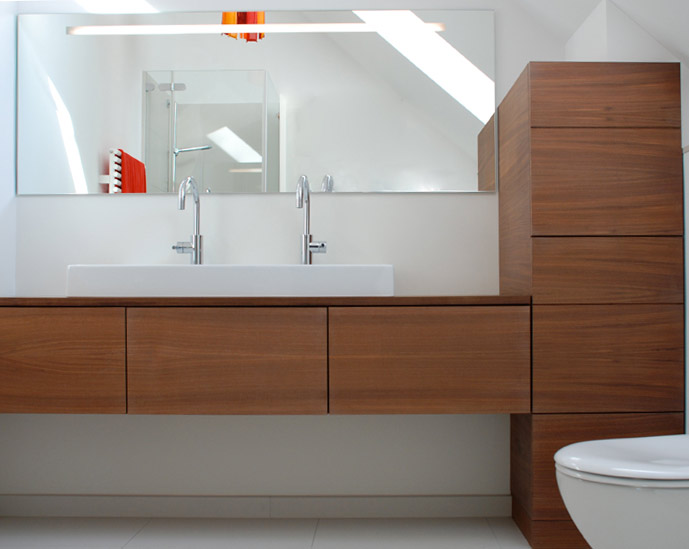 Elternbad Durch die Kombination von „warmen“ Holzoberflächen in Nussbaum und einem weißen großformatigen Kunststeinboden entsteht eine Atmosphäre schlichter und zeitloser Eleganz. Die reduzierten Details der integrierten Spiegelbeleuchtung und der Verzicht auf sichtbare Möbelbeschläge unterstreichen die hochwertige Ausstrahlung der Inneneinrichtung.