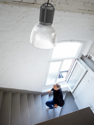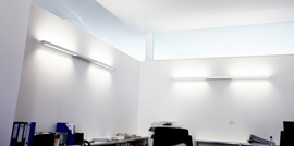 Das Lichtkonzept besteht aus der Kombination von fest installierten indirekt strahlenden Wandleuchten und individuellen BAP geeigneten Standleuchten an den Computerarbeitsplätzen. Der Eingangsbereich verzichtet auf eine Empfangstheke zugunsten einer kommunikativen Team- und Kundenzone.
