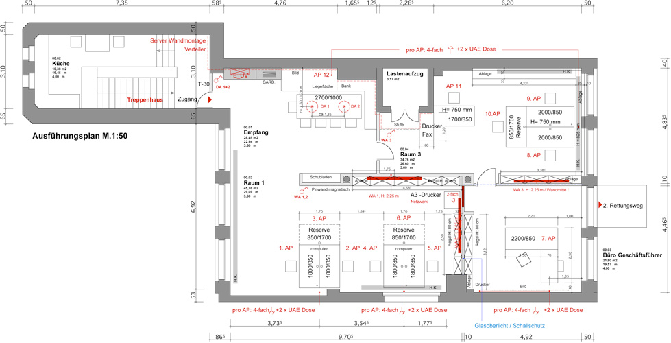 Die Zonierung der Grundfläche sollte einerseits ein konzentriertes Arbeiten der einzelnen Mitarbeiter fördern und gleichzeitig noch genügend Kommunikation und Gedankenaustausch ermöglichen. Hierzu wurde ein in der Längsachse ausgerichteter Raumteiler montiert, der oberhalb von 2.50 m zur besseren Lichtverteilung verglast wurde. Die Netzwerkverkabelung für die Arbeitsplätze wurden ebenfalls dort untergebracht.